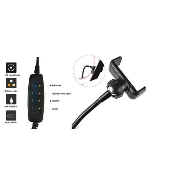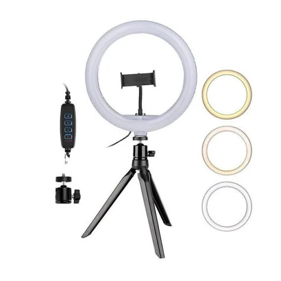 ویژگی ها: دارای 3 طیف رنگ نوری قابلیت تنظیم روشنایی دارای ریموت کنترل سیمی قطر رینگ لایت 26 سانت ارتفاع سه پایه تا 2.2 متر مناسب تولید محتوا-عکاسی-آرایشگاه و.. همراه رینگ لایت:هوادر -ریموت سیمی-پایه نگه دارنده گوشی-سه پایه