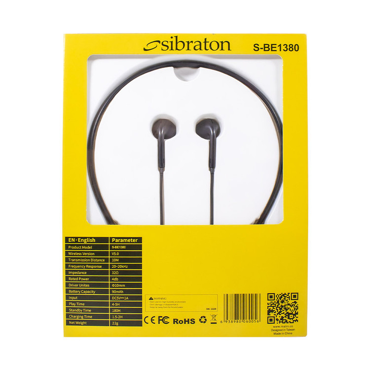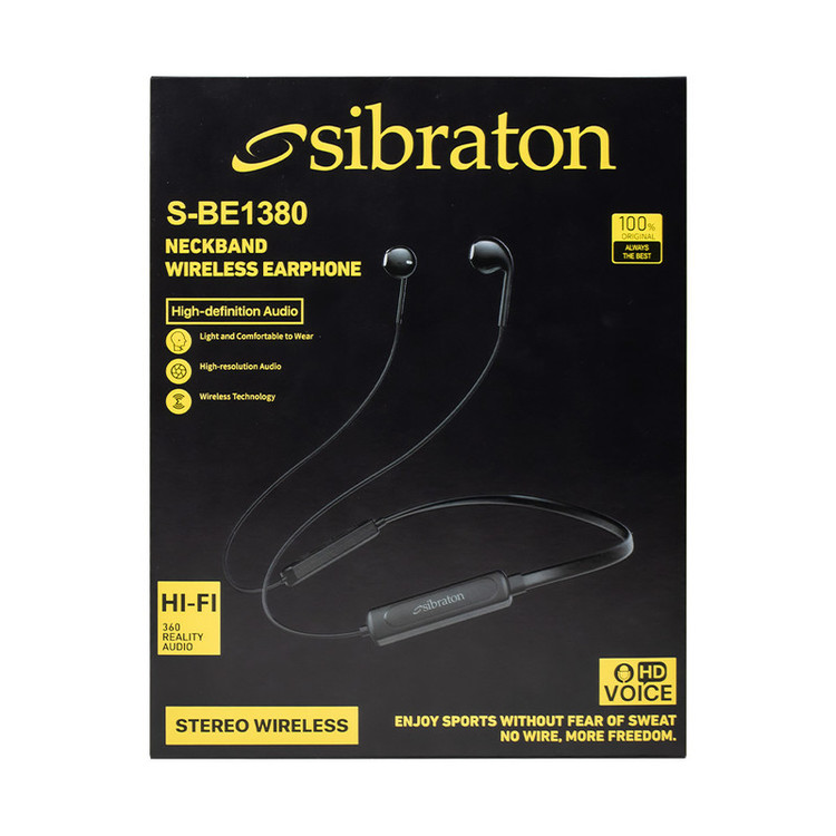 یکی از کالاهای پراستفادهی کاربران که موجب شده تا جای هندزفریهای قدیمی را بگیرد، ایرفونها هستند. کمپانی سیبراتون در راستای تولیدات با کیفیت و پرفروش خود در زمینهی هدفون و هندزفری، اقدام به تولید و عرضهی محصولی مطابق با استانداردهای جهانی و پرکاربرد کرده است. ایرفون بلوتوثی سیبراتون مدل S-BE1380 در دسته ایرفونهای دورگردنی که عموماً با نام نکبند میشناسند، قرار میگیرد.یکی از ویژگیهای کاربردی ایرفون (نکبند) بلوتوثی سیبراتون مدل S-BE1380 میتوان به نگهدارنده گردنی انعطاف پذیر آن اشاره کرد که میتواند تاثیر بسزایی در نگهداری و افزایش طول عمر محصول داشته باشد. علاوه بر آن، این محصول مجهز به پنل مدیریت صدا و پاسخگویی به تماس است و کیفیت و حجم صدای خروجی قابل قبولی دارد. انرژی مورد نیاز آن نیز از طریق باتری داخلی تامین میشود. همچنین این ایرفون مشکی رنگ با طراحي بسيار زيبا با جنس بدنهی پلاستیک نرم و قطر درایور 10 میلیمتر از وزن نسبتا کمي با مقدار 22 گرم برخوردار است. اين امر باعث ميشود، کاربر با استفادهي طولاني مدت خسته نشود. جنس قسمت دورگردني اين ایرفون، انعطاف پذير است و از شکسته شدن در طول فعاليتهاي روزانه جلوگيري ميکند.پاسخ به تماسهای تلفنی و پخش آهنگ فقط با فشردن یک دکمه برای شما امکان پذیر است. شما میتوانید برای استفاده از ایرفون وایرلس S-BE1380 توسط بلوتوث نسخه 5.0 با محدوده عملکرد 10 متر به آن متصل شوید. امپدانس و فرکانس این ایرفون به ترتیب 32اهم و 20هرتز الی 20کیلوهرتز میباشد. از دیگر ویژگیهای این ایرفون میتوان بیان کرد که از طریق بلوتوث به گوشی همراه شما متصل میشود بنابراین شما را از قید و بند کابلهای صوتی رها میسازد. دارای یک پورت تایپ سی جهت اتصال کابل شارژر نیز میباشد.