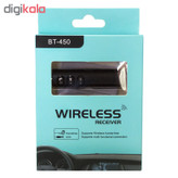 دستگاهی که در تصویر مشاهده میکنید، یک وسیله برای ارتباط دستگاه بلوتوث دار به دستگاه بدون بلوتوث است.توسط دانگل بلوتوث AUX BT-۴۵۰ می توان کلیه دستگاه های بلوتوث دار مانند لپ تاپ، iPhone, iPod, iPad، تبلت، موبایل و … را بدون سیم به وسایلی که دارای ورودی AUX مانند پخش خودرو، اسپیکر، هدفون و … متصل کرد. دانگل بلوتوث AUX پیشرفته BT-۴۵۰ از برندهای معروف و باکیفیت در حوزهی همین محصولات است. افراد بسیاری گوش کردن به موسیقی در حین رانندگی برایشان لذتبخش است، و موزیک مورد نظرشان درون تلفنهمراهشان میباشد، با ورود دانگل بلوتوث AUX پیشرفته BT-۴۵۰ به بازار، این دستگاه توجه بسیاری را به خود جلب کرد. از این طریق به راحتی و بدون وجود کابل وسیم ،کیفیت صدای بسیار عالی، میتوانید موسیقی دلخواهتان را گوش کنید. محدودهی عملکرد دانگل بلوتوث AUX BT-۴۵۰ برابر با ۱۰ متر است. نصب و راهاندازی دانگل به سرعت انجام میشود و برای شروع به کار با آن، نیاز به انجام تنظیمات خاصی نخواهید داشت.این دستگاه دارای کلید ریموت موزیک و +/- صدا و پاسخگویی تماس است.برای وصل نمودن باید دکمه پاور را چند ثانیه نگهداشت تا چراغ چشمک زن قرمز و آبی شود و در موبایل خود انرا جستجو نمایید و وصل شوید.از دیگر مزایای مهم این دستگاه این است که می توان به راحتی در ماشین مکالمه کرد.
