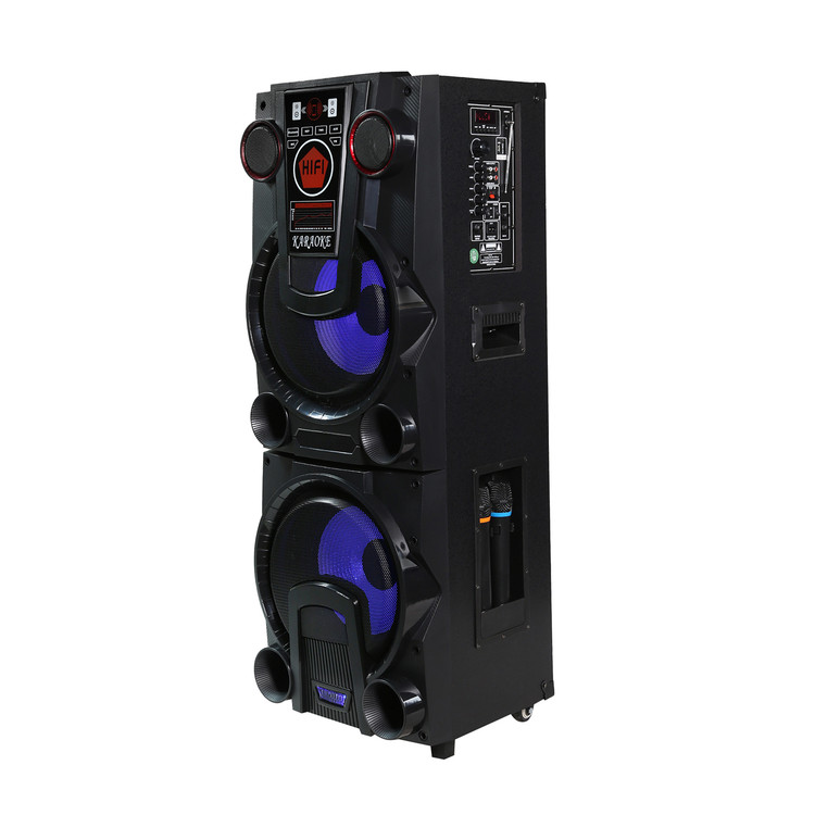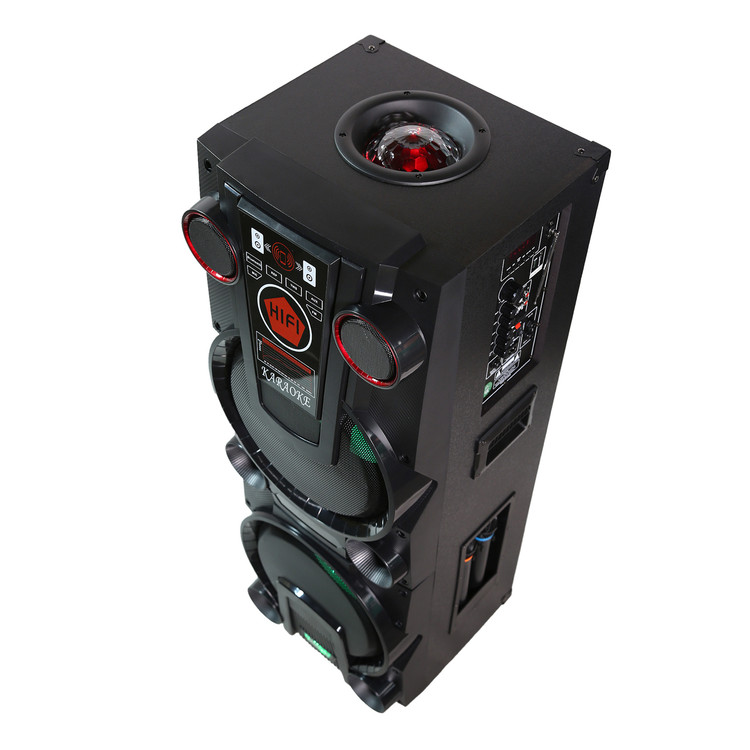 میکروفون بیسیم: وجود دو میکروفون بیسیم همراه اسپیکر، امکان اجرای زنده و کارائوکه را فراهم میکند.